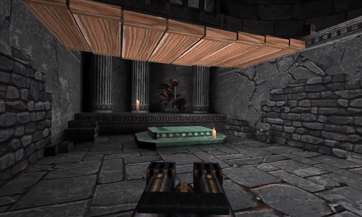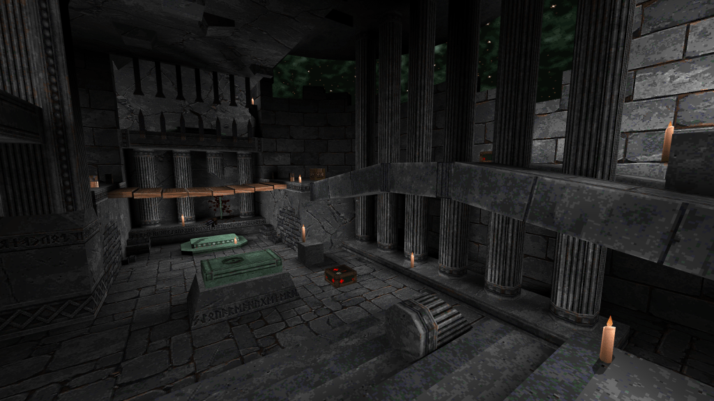 As with all my Quake maps, I had the help of a great community. Textures are once again by Ben “Makkon” Hale, who also inspired some of the pillar brushwork. Features like breakable surfaces, falling debris, corpse models, candles, and many others were made possible by the progs_dump modding team working on the shoulders of decades of other modders. Extra thanks to David “dumptruck_ds” Spell, Zaratzara, and The Solipsist for playtesting.