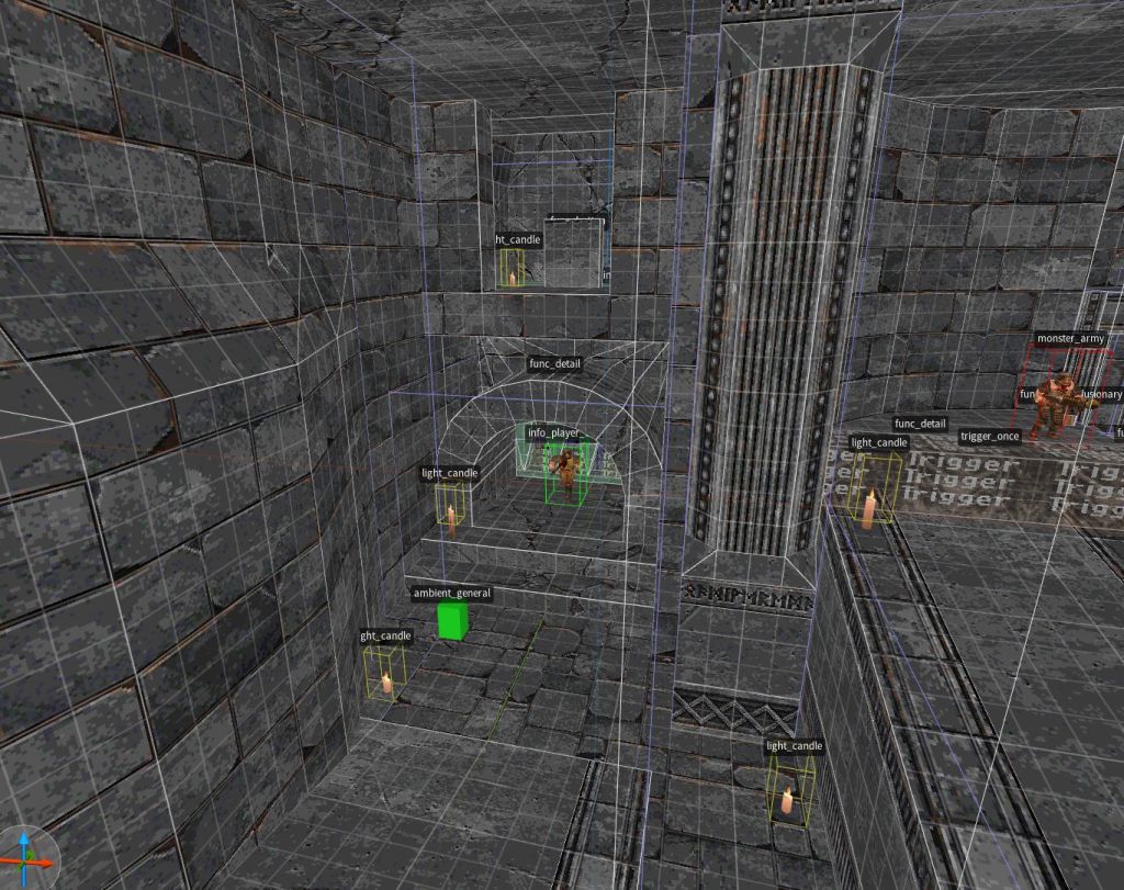 I wanted the player to feel they had arrived in a tomb as it was being disturbed by other enemies. I also wanted the player to unlock an extra power. This would manifest as a rocket launcher the player uses to destroy bricked-up walls. As an added challenge I tasked myself with creating the map within 1024 x 1024 x 1024 Quake units.