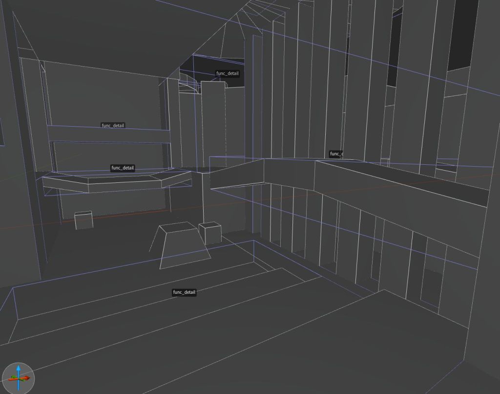 The blockout began as a simple but dense three-tier interior with multiple gates to direct player flow, such as forced falls and destructible walls. When working with a hard size limit, the temptation is to create lots of smaller rooms and tight corridors. But I find that Quake’s speedy combat works best when the player has room to maneuver. For that reason, I kept the ground floor as an arena-style space and the other two floors subdivided into two principal areas.